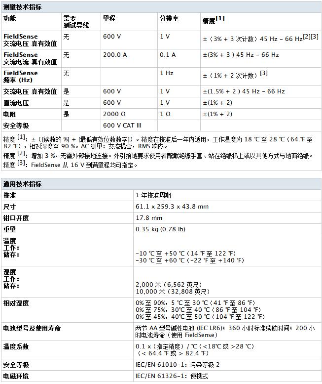 • FieldSense 技术,无需接触带电电压,即可测量交流电压、电流和频率+
