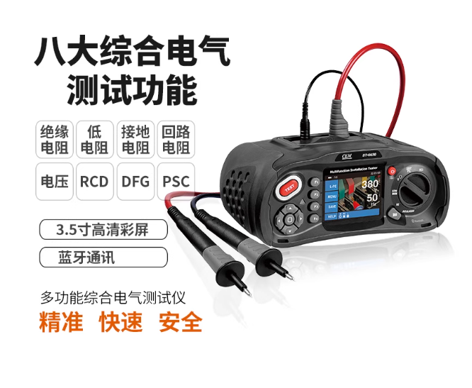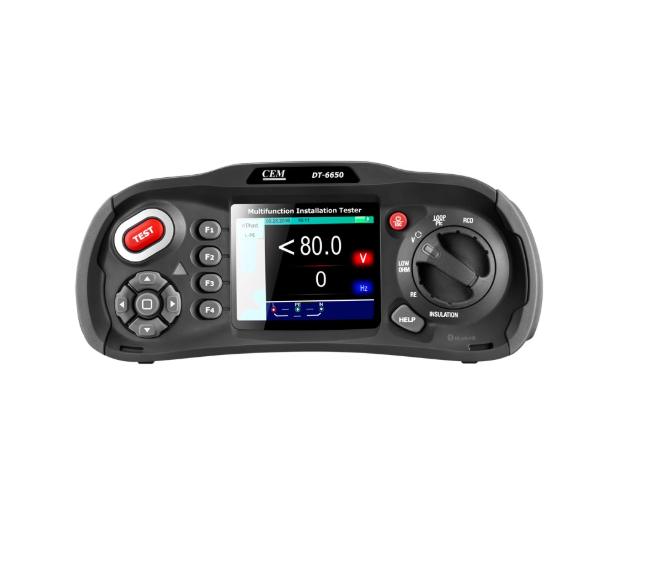 CEM DT-6650专业的多功能电气综合测试仪, 3.5"高清彩色TFT液晶显示屏,双注塑机壳,可测绝缘电阻、接地电阻、低电阻、回路电阻、电压、RCD、PFG和PSC,并有配套软件系统,同时具有快速取样、双显示、清晰的按键和大屏等优点,方便用户简单清晰地操作,可以确保电气装置在家庭、商业、工业等领域应用的安全性,以及固定接线安装的安全性和准确性,是电力电气领域的专业电力检验工具。